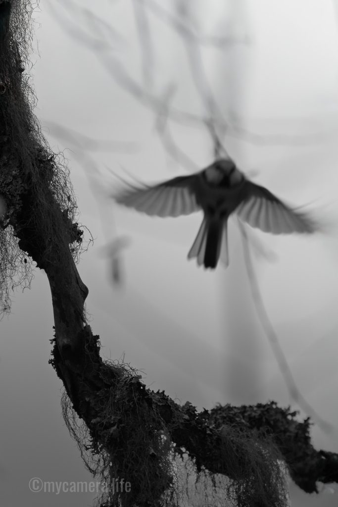 Yesterday morning, the forest was almost silent. A soft mist blurred the shapes of branches and moss until they seemed to melt into one another. Just then, this little blue tit, or maybe a great tit, I didn’t have time to be sure, appeared and hovered for a brief moment, wings spread wide as if time had stopped.
